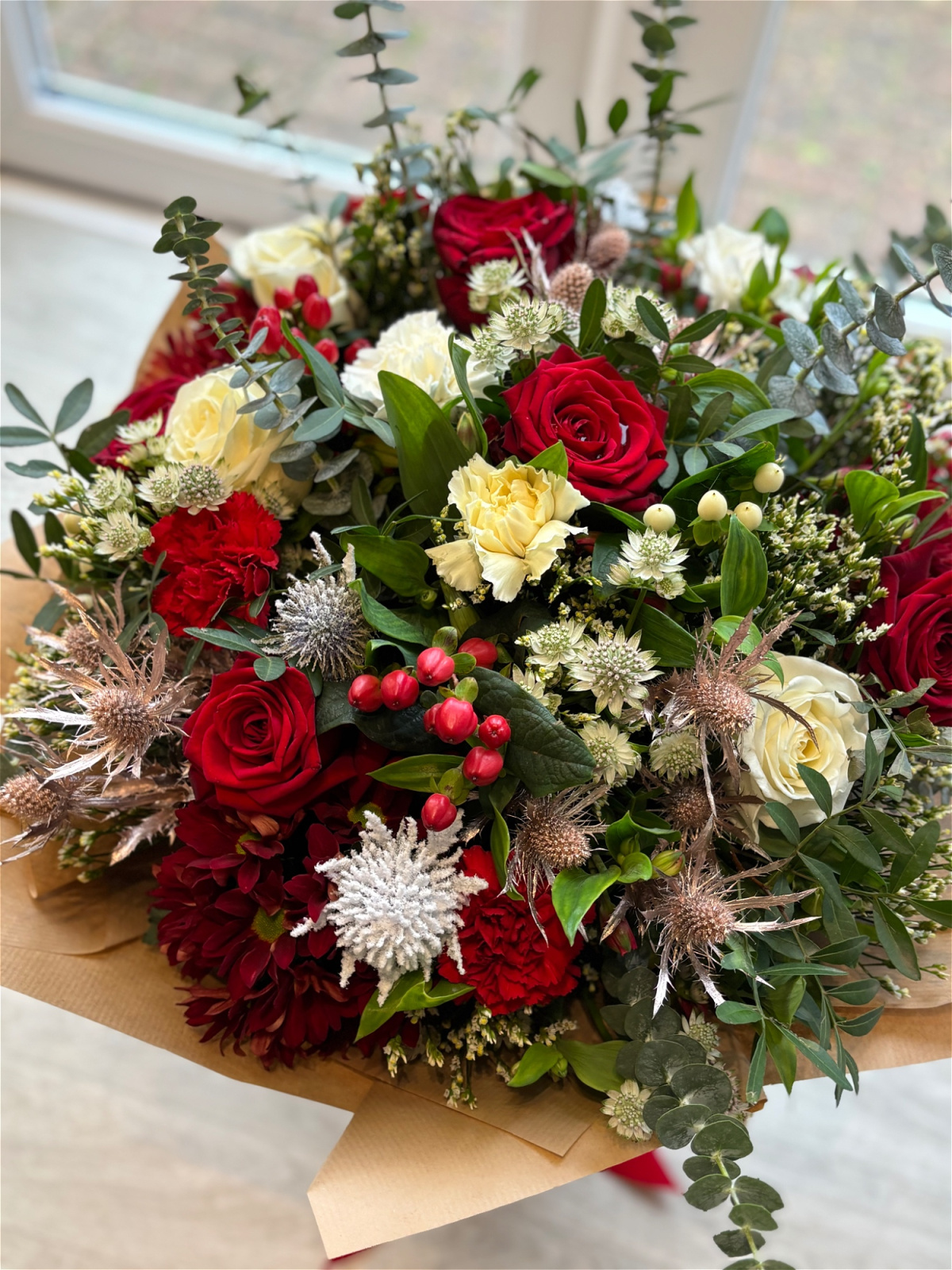 Indulge in the magic of the season with our Luxury Christmas Bouquet — a stunning arrangement bursting with rich festive tones, seasonal foliage, and elegant touches of Christmas sparkle. Perfect for gifting or adding a touch of opulence to your own home this Christmas.